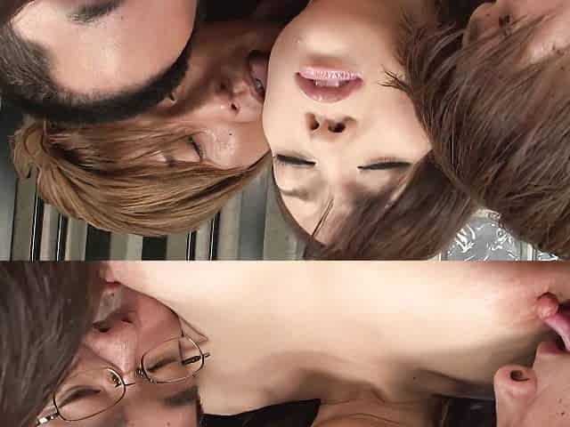 Busty Japanese Girl Blow Two Guys Before Masturbating in Front of Them