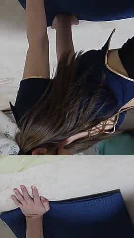 Busty Flight Attendant in No Bra, Miniskirt, Wedgie Thong Panties, and Stockings During Sexy Fitness Training in Apartment