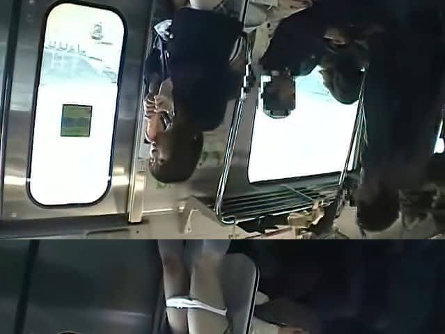 Sexy bow legged Japanese girl gets on a mind your business bus