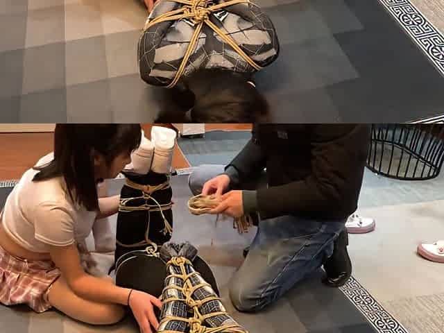 Two Chinese Girls Tied, One Wearing Cloth Mask