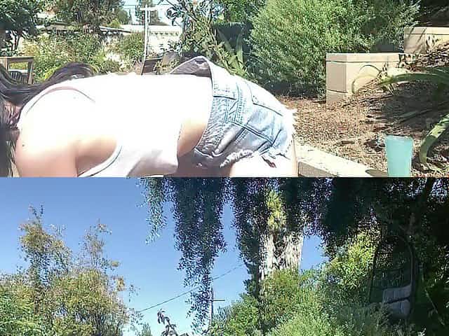 Cute brunette pulls her jeans shorts down to pee outdoors