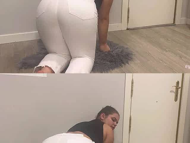 Chubby girl talking on the phone with her boy friend pee in her jeans