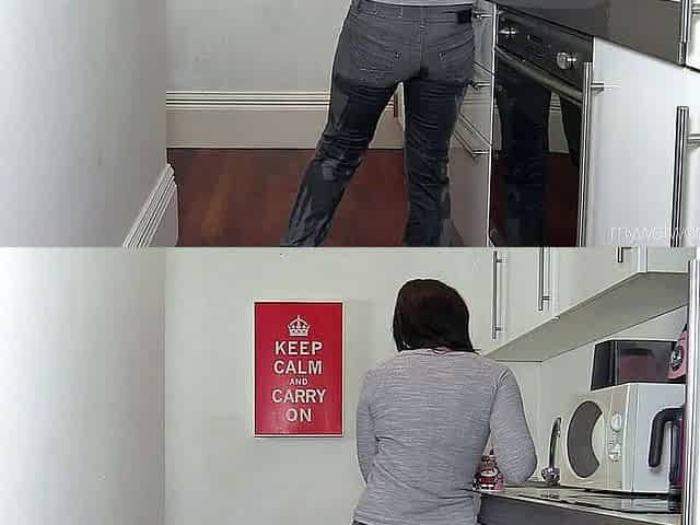 Stripping her sexy jeans and trying a new sex toy in the kitchen