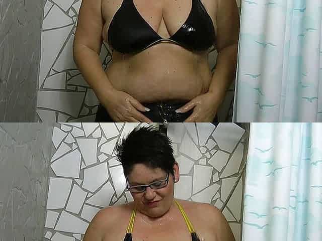 In bikini and jeans in d shower