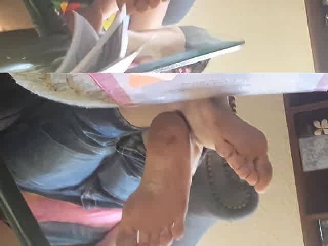 Hottie In Blue Jeans Dangles Her Slippers Underneath The Table At The Library