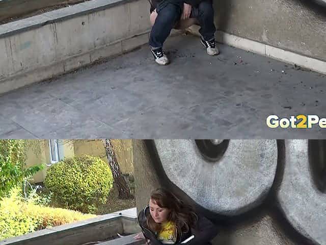 A bit plump amateur brunette gal squats down and pisses between refuse bins