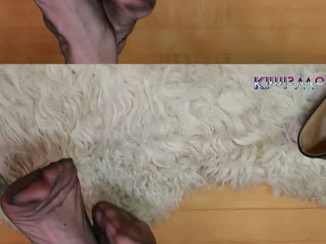 Black nylons and peep toes with blue denim: teasing feet in size 35