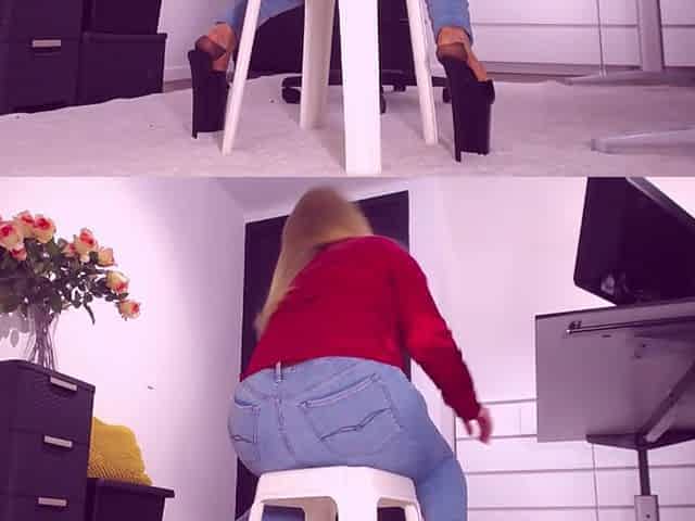 978. Blue Jeans JOI, Nylon Feet JOI - Rht Polka Dots Vintage Stockings Under Tight Replay Jeans, Satin Blouse No Bra, Tits Flash