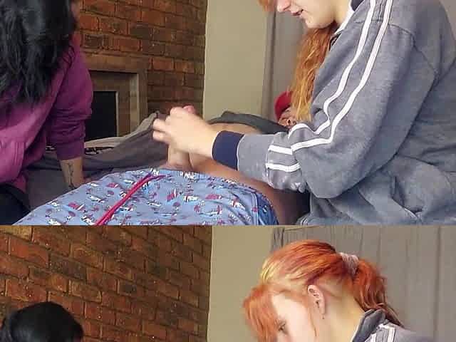 Two shy girls playing with my massive dick