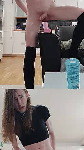Femboy jerks off his large schlong and cums
