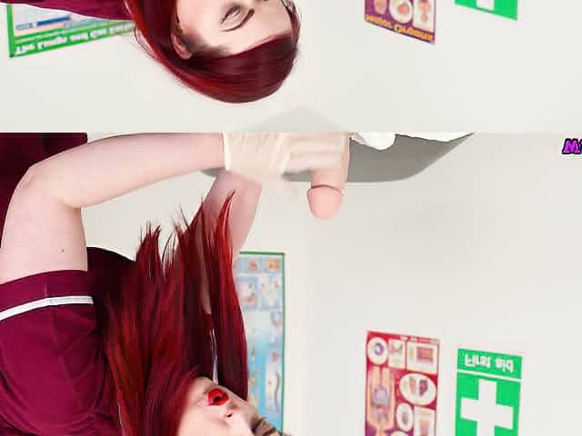 Red haired busty nurse in uniform Jaye Rose sucks and jerks off hard penis