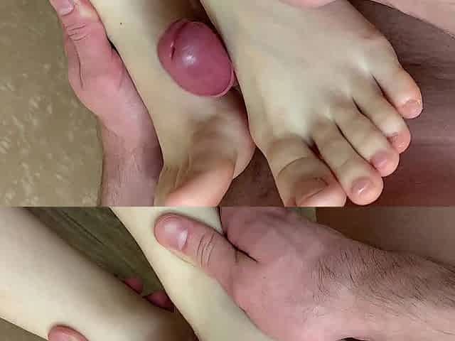 My Step Brother Likes It When I Jerking Off His Large Knob With My Feet! Large Spunk fountain On Feet