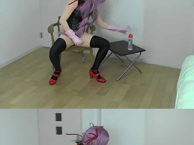 A femboy with a dildo in his booty jerks off his dong and cums