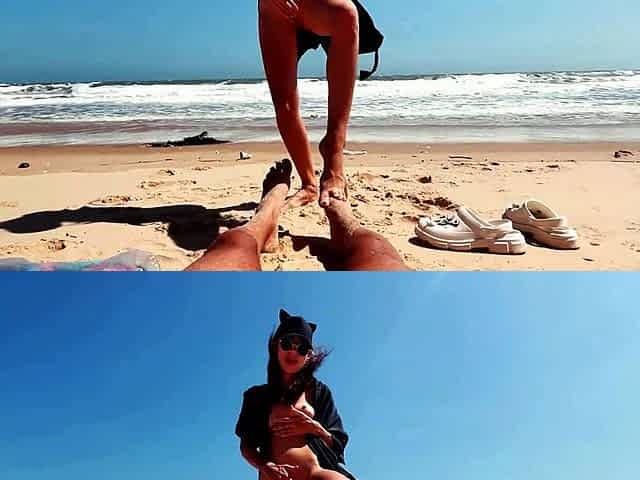 Teen girl gets off on a nude beach while playing with her feet and a guy jerks off nearby