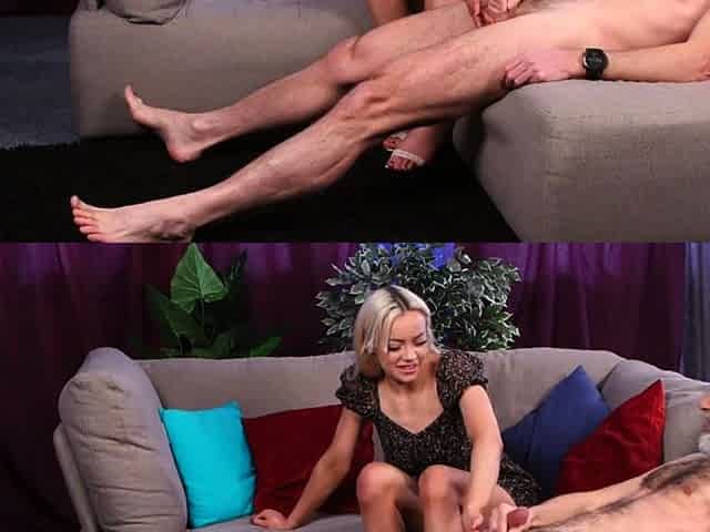 "Amateur blonde Maria Kazi takes cock deep POV and strokes it with her hands and feet"