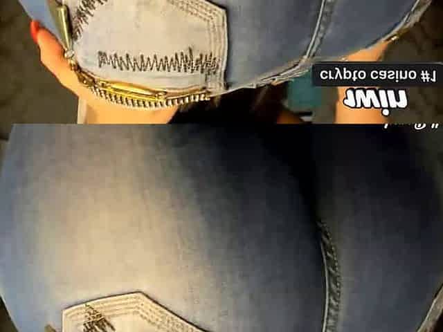 Mulher latina sensualmente em calça jeans apertada exibe suas curvas e realiza uma punheta guiada para você.