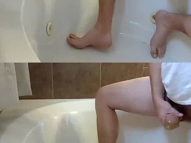 Pissing into a fuck-rubber in the bathtub