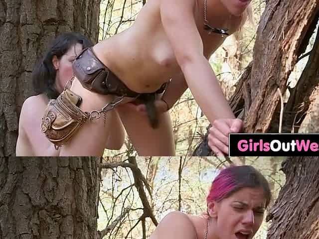 Amateur babes explore each other's bodies during a hike in the forest