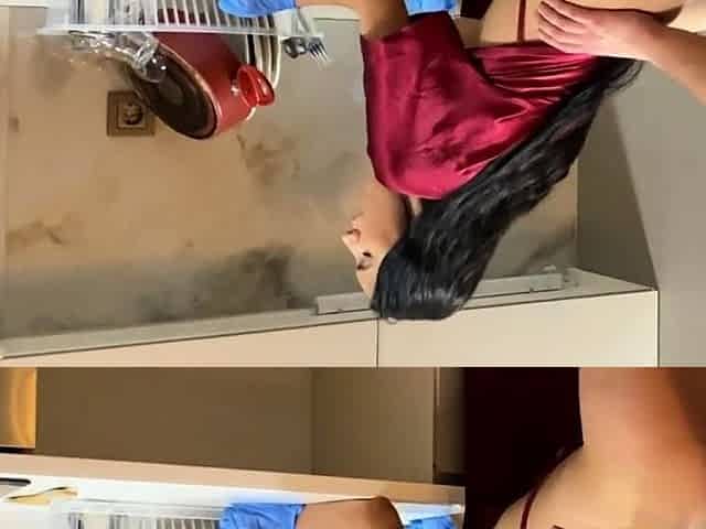 Honey Dory, the sexy brunette, masturbates in the kitchen.