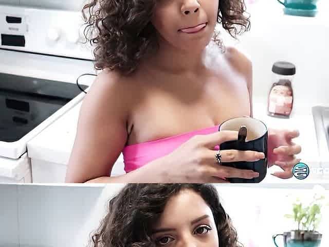 Almanegra marvelous brunette hair shows off exposed in her kitchen!