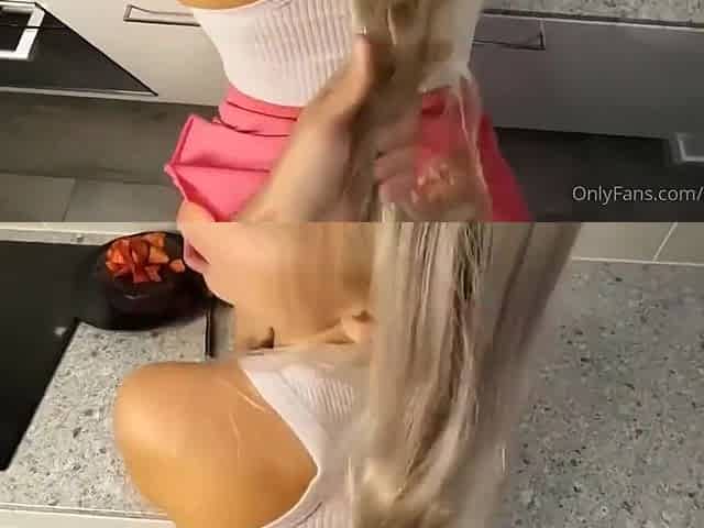Blonde babe Aaliyah Love cooks in the kitchen and gets fucked hard