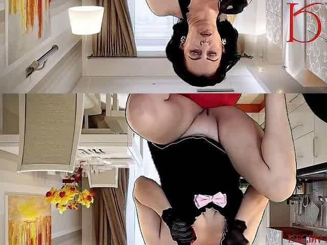 The lady without panties in the kitchen inflates balloons. The balloons are bad and cannot be inflated. 3