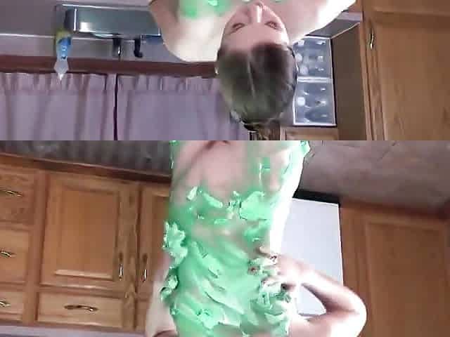 "Cute slut with perky tits exhibits her body as colorful art on kitchen floor"