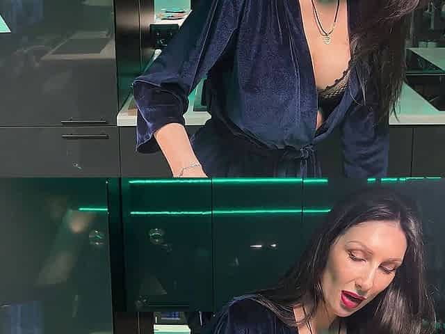 Busty Latin girl Megan in dark colored pantyhose in the kitchen