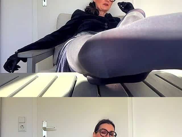 Redhead Lady Scarlet gives a footjob in trendy pantyhose