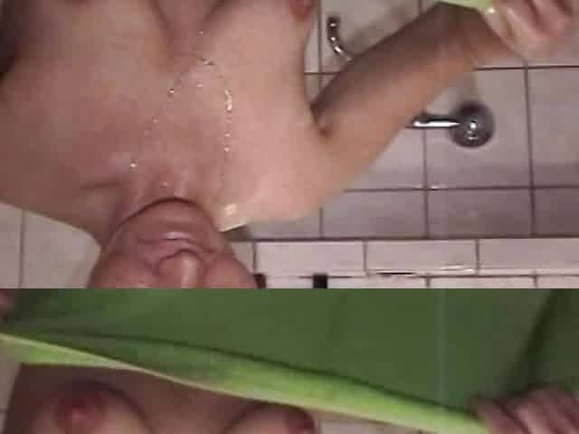 "Short haired German lady pleasing her hairy muff with a dildo"