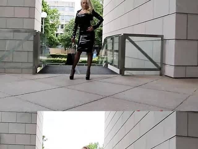 Hot golden-haired in ebony latex nylons masturbates to an climax