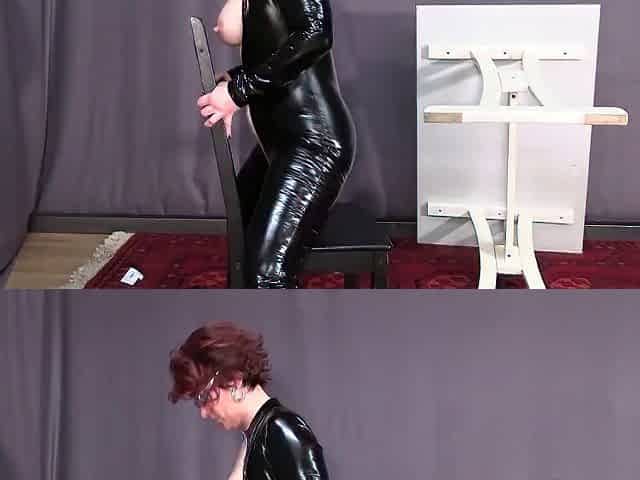 "Black Dildo Fucking in Latex Outfit, Fishnet Stockings, and High Heels"
