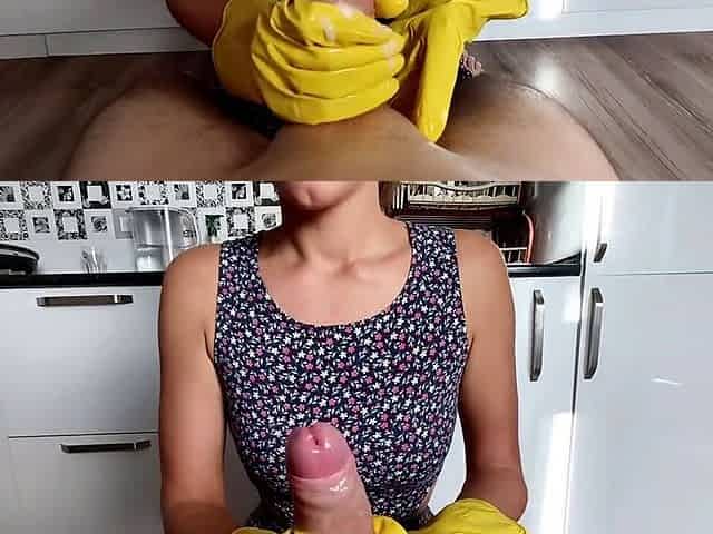 POV CFNM ebony latex gloves spitting tugjob, cum gulp.