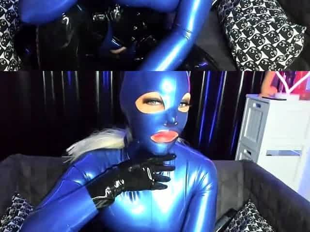 Hot sissy lola doll en latex noir et cheveux bleu enfourche un gros god en se touchant qualité HD