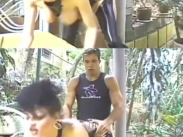 Busty Chocolate Girl In Red Latex Plays With Her Nipples While Dude Fucking Her