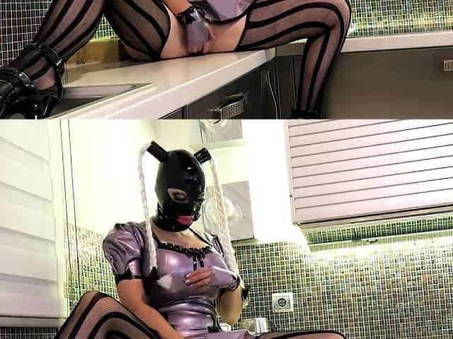 Amateur brunette in latex lingerie fucks hardcore in kitchen