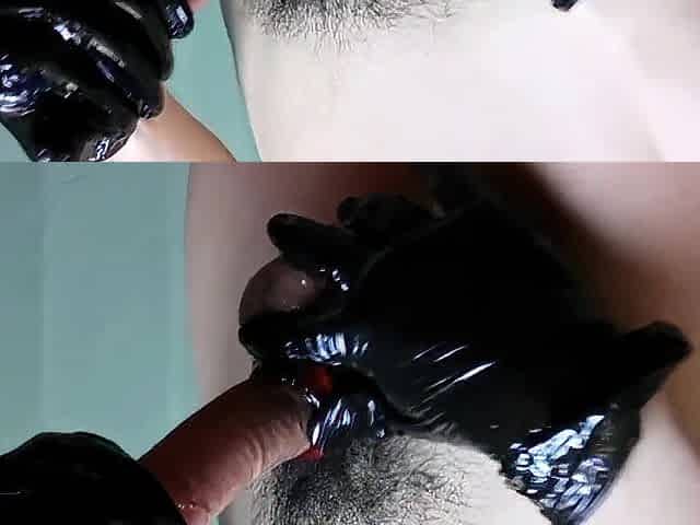 shlong growth exercise with gloves and lubricant flowing from arousal