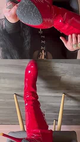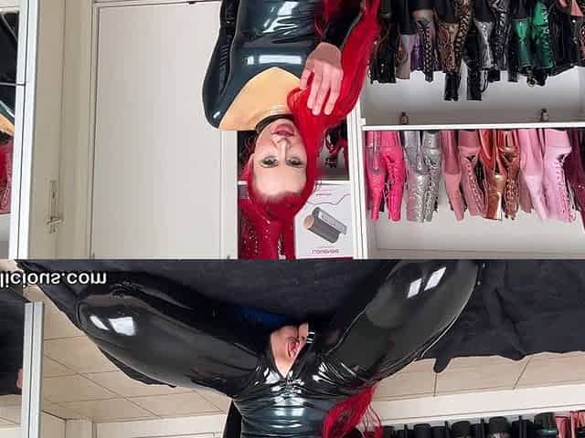 Hawt Sissy lola doll red hair and full red latex high heel ride a large sextoy with chastity
