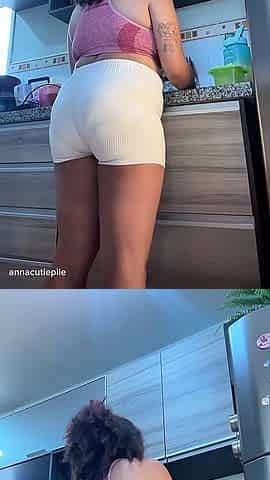 Gassy Chubby Girlfriend Washing Dishes Natural Loud Farts in Tight Shorts