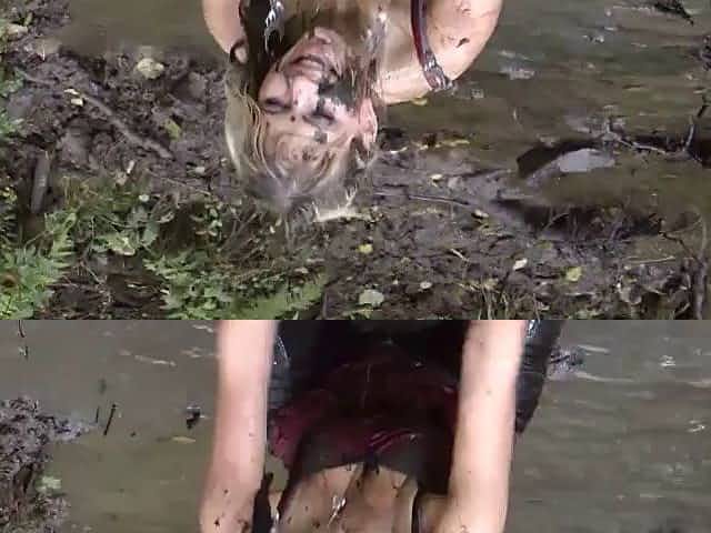 Beautiful blonde woman in leather leggings and rubber boots plays in the mud