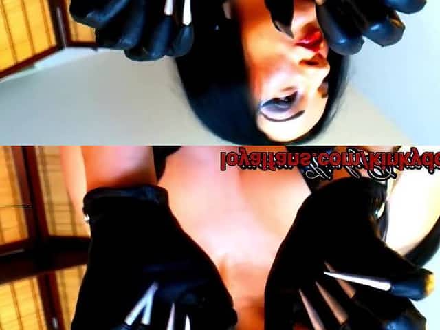 Sexy brunette hair in ebony, leather panties is playing with her fresh sub and enjoying it