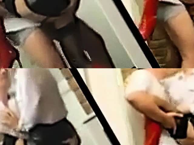 A close-up on a camel toe of a Japanese woman while she's giving a public speech