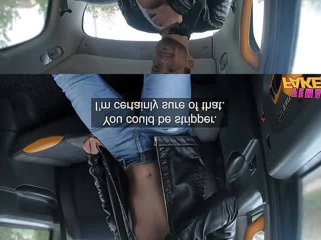Faux taxi fetish goddess in ebony leather gets assfuck creampie