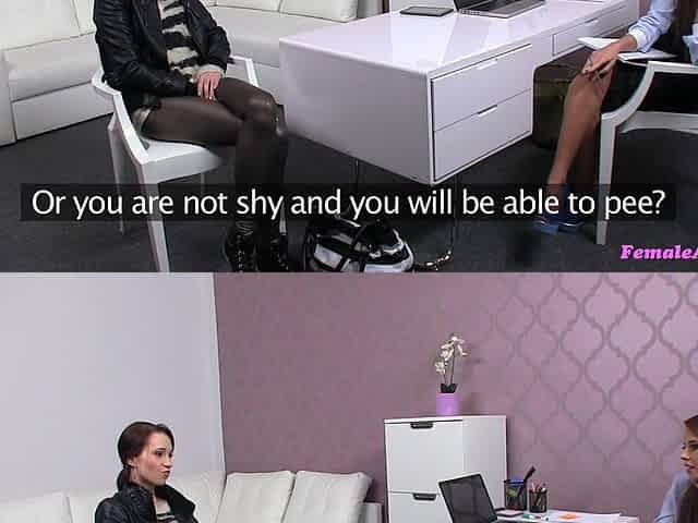 Nervous Brunette Relaxes Around Lesbie Agent's Wet Pussy
