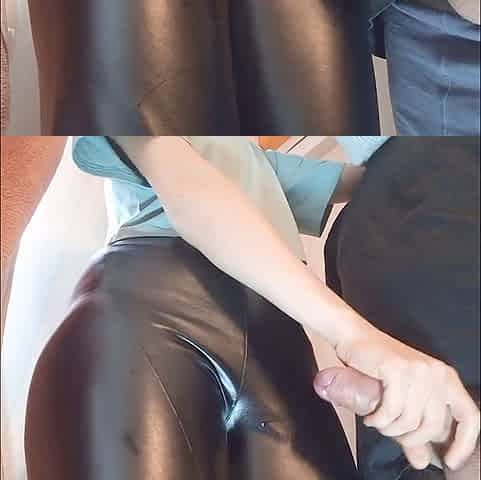Couldn't resist that juicy booty in tight leather pants — I got to rub and cum on her