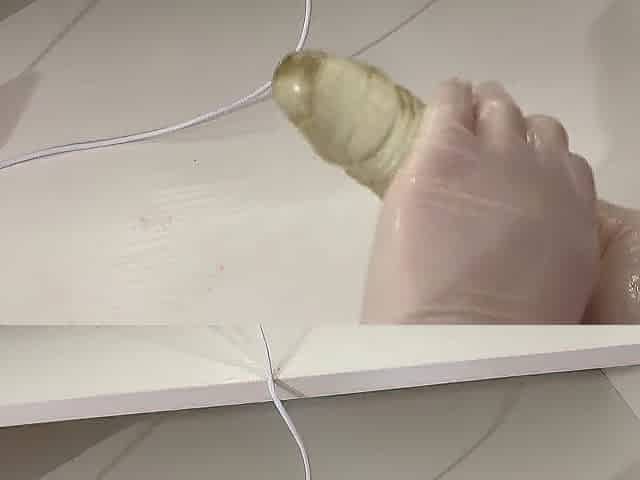 I give a tugjob to the sex tool with oily hands in medical white gloves