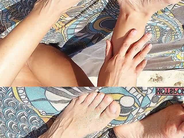 Beach cutie showing her Nice-looking toes, gorgeous feet, legs, nice-looking vagina and bazookas