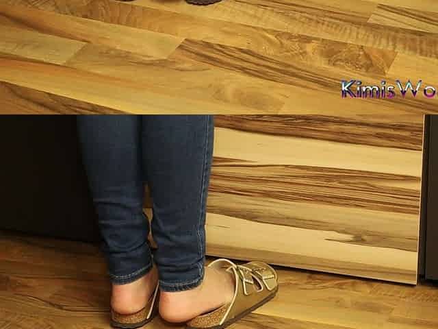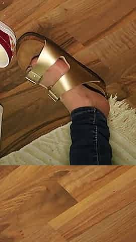 Jeans and Gold Two-strap Sandals - Nylon Feet Tease