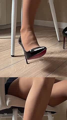 Foot job with ebony heels and opaque tights