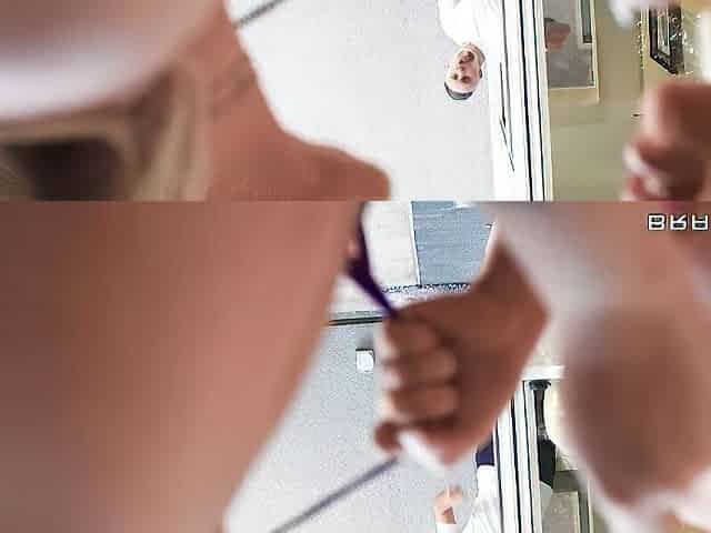 Micro Thong Bikini, Mini Skirt, Knee-high Stockings, View of Japanese Girl with Nice Body and Big Tits From Under the Desk